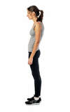 -Poor posture with a slouched or bent appearance evident in the middle of the back